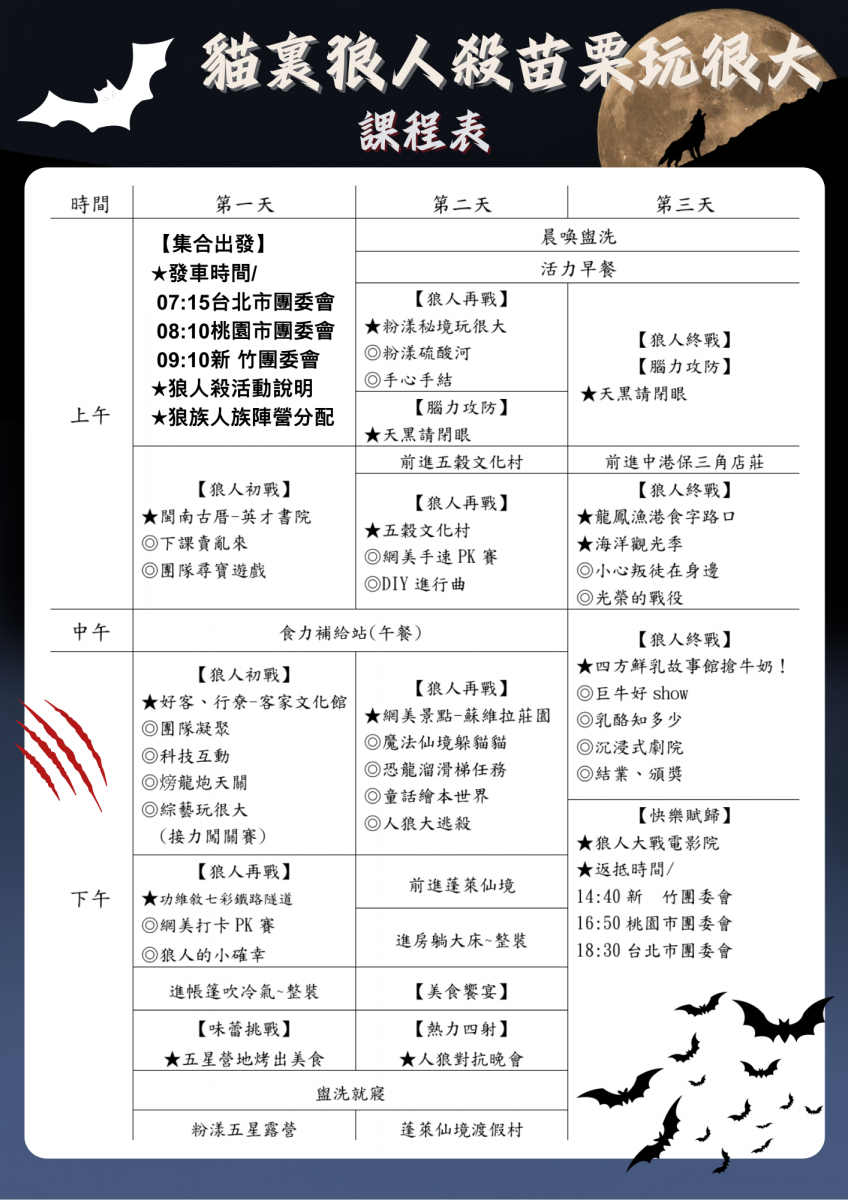 將「狼人殺紙牌桌遊」遊戲角色以真人Cosplay方式進行,結合時下最夯綜藝節目遊戲內容、救國團探索教育體驗活動,在苗栗炙手可熱的網紅景點-蘇維拉莊園、英才書院、粉漾露營區(有冷氣、床和枕頭的懶人露營首選)、龍鳳漁港、四方鮮乳故事館、五穀文化村、功維敘七彩鐵路隧道等特色景點進行團隊尋寶、趣味競賽及闖關活動,活動精彩指數爆表,快快加入人族與狼族的世紀大戰!
